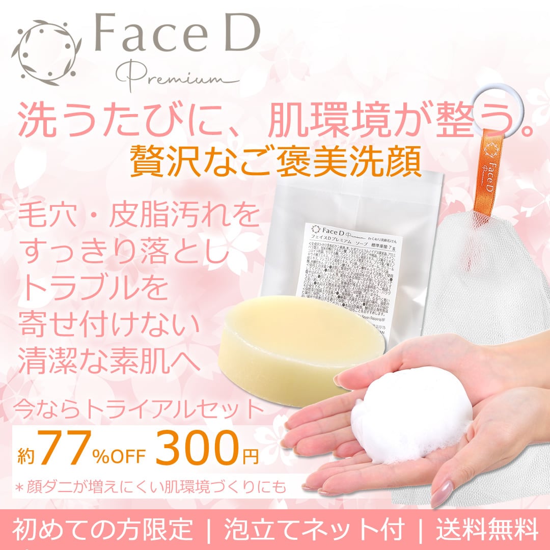 Face D Premium フェイスDプレミアムは、「洗顔は、ただ汚れを落とすだけでいいのか」そんな疑問から生まれた、スキンケア発想の洗顔シリーズです。顔ダニ石鹸として支持されてきたFace Doctor フェイスドクターの思想を受け継ぎ、成分・処方・製造環境を一から見直しました。主成分には、サジー(シーバックソーン)をはじめとする厳選した美容成分を贅沢に配合。洗うたびに肌環境を整え、素肌本来の力を引き出します。日本国内製造のMade in Japan品質。毎日の洗顔を、肌と向き合う上質な時間へ。