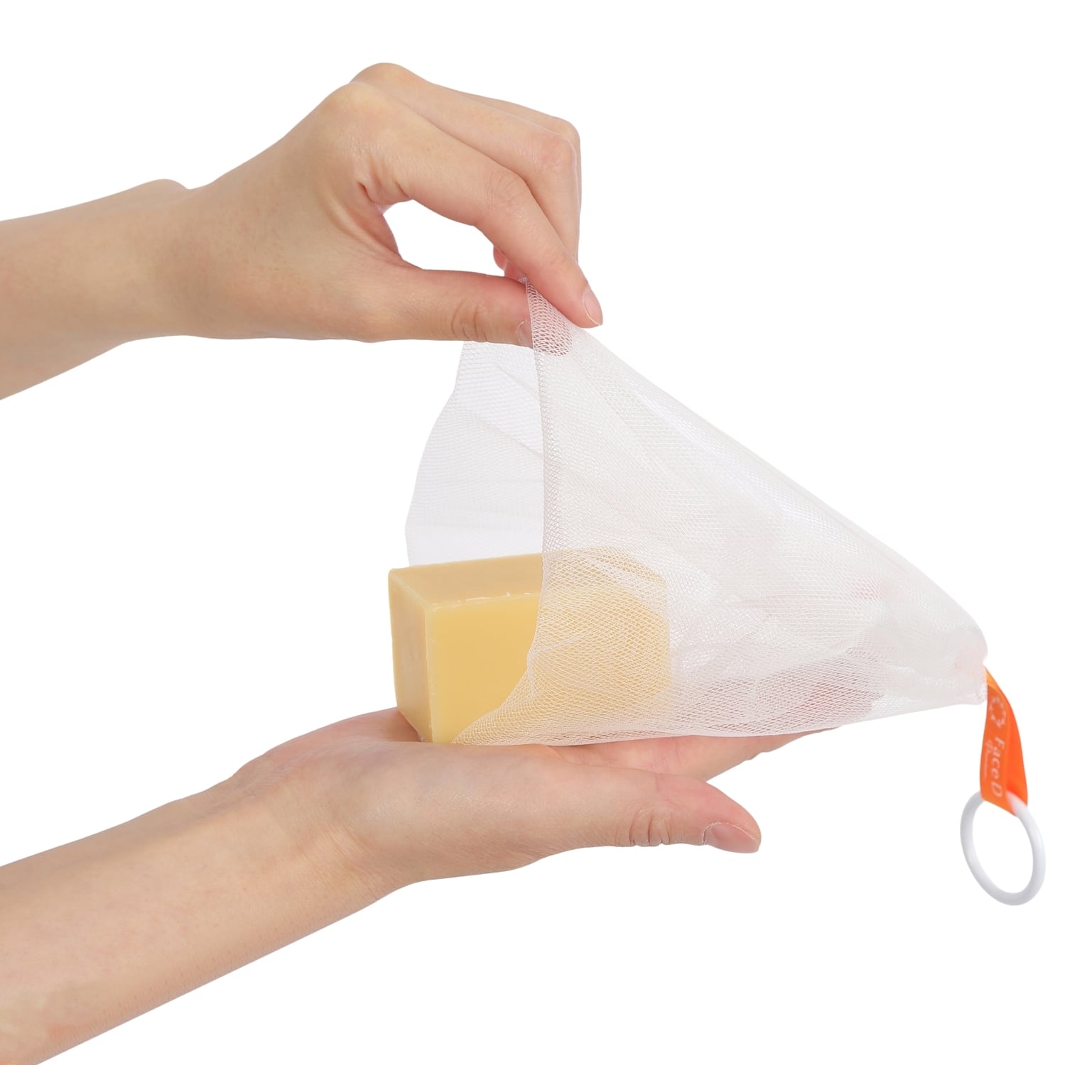 Face D Premium フェイスDプレミアム 泡立てネットを少なめのぬるま湯(水でもOK)でぬらして、Face D Premium フェイスDプレミアム ソープを包み込むように泡立てネットとソープをこすり合わせて濃密な泡をつくります。